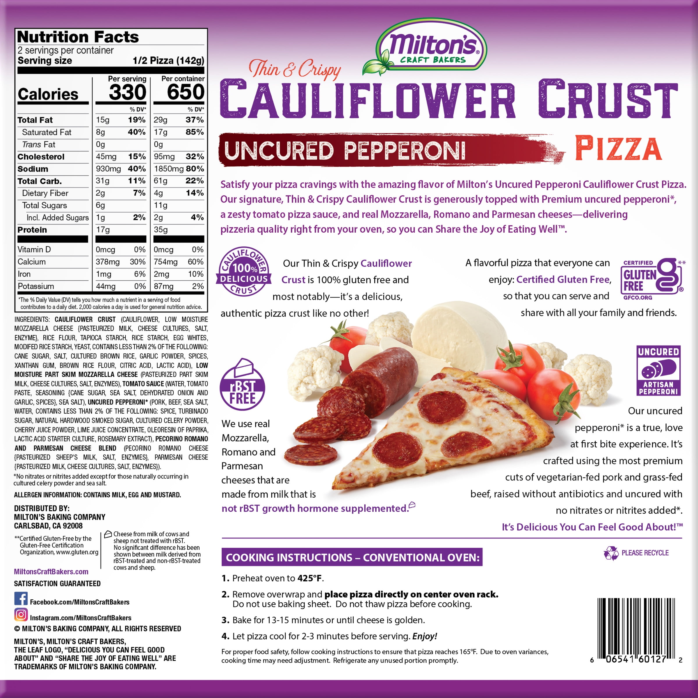 Frozen Cauliflower Crust Pizza Milton S Craft Bakers